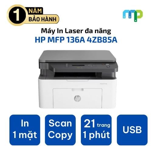 HP Laser MFP 136A 4ZB85A là mẫu máy in laser đen trắng đa chức năng, tích hợp in, sao chép và quét trong cùng một thiết bị. Sản phẩm được thiết kế dành cho văn phòng nhỏ, hộ gia đình và người dùng cá nhân cần một thiết bị in ấn gọn gàng, bền bỉ và chi phí vận hành hợp lý cho nhu cầu sử dụng hằng ngày.