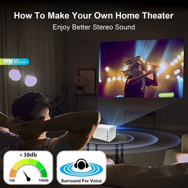 Hệ thống loa stereo tích hợp cho âm thanh rõ, đủ lớn để sử dụng trong phòng kín. Độ ồn vận hành dưới 38dB, không gây khó chịu khi xem phim hoặc họp nhóm. Người dùng có thể kết nối thêm loa Bluetooth để tăng hiệu ứng âm thanh khi cần trải nghiệm sống động hơn.