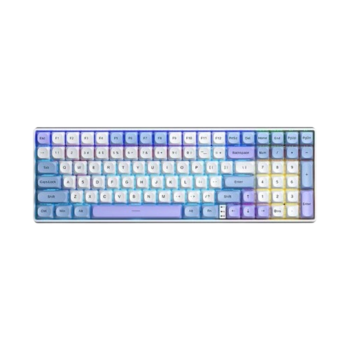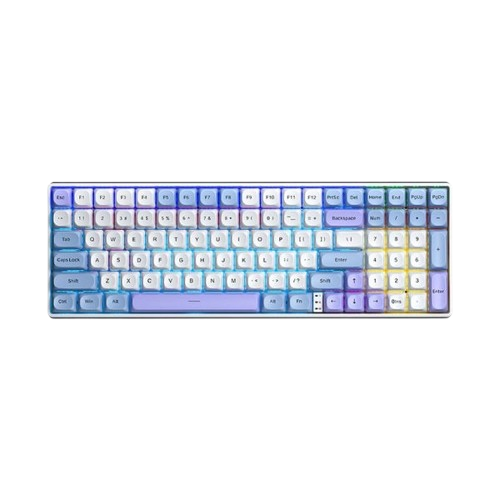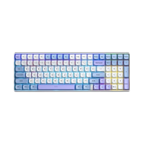 | Đặc điểm nổi bật | • Kết nối linh hoạt **Tri-Mode**: Wired + 2.4G + Bluetooth, thuận tiện chuyển đổi giữa desktop, laptop, tablet. • Switch Red – cảm giác nhấn nhẹ, mượt, phù hợp chơi game & gõ văn bản. • Hỗ trợ hot-swappable – bạn có thể thay switch theo ý muốn (nếu phiên bản thực tế hỗ trợ). • Layout 99 phím giúp tiết kiệm không gian bàn nhưng vẫn giữ đủ tính năng. • Thiết kế màu sắc nổi bật (xanh dương + trắng + tím) kết hợp RGB để tạo điểm nhấn cho setup gaming. |