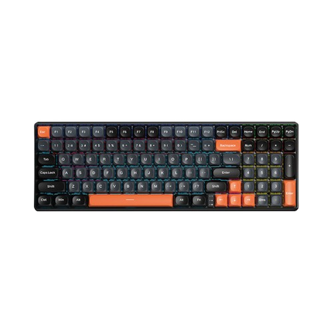 | Đặc điểm nổi bật | • Switch Blue – cảm giác nhấn **clicky** rõ ràng, phù hợp cả chơi game và gõ phím thích âm thanh. • Layout 99 phím giúp tiết kiệm diện tích bàn nhưng vẫn đầy đủ phím quan trọng. • Keycap PBT và khung cấu trúc cao cấp (gasket-mount), giúp cảm giác gõ tốt và âm thanh ổn. • Thiết kế màu Đen/Xám/Cam phối khá nổi bật, cùng đèn RGB giúp setup trở nên có phong cách. |