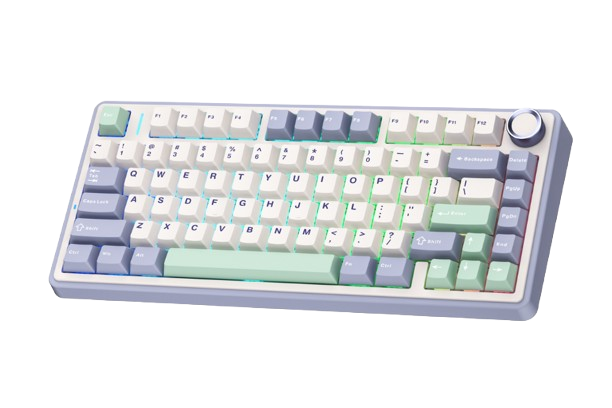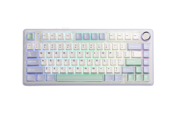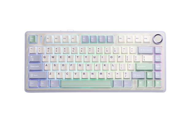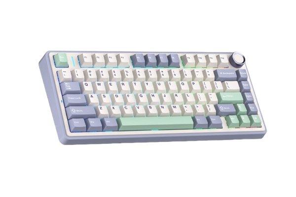 - AULA F75 nổi bật với phối màu Tím nhạt + Be + Xanh lá, tạo nên tổng thể hài hòa, dễ chịu mà vẫn rất cá tính. Layout 75% nhỏ gọn giúp tiết kiệm không gian bàn làm việc nhưng vẫn giữ đủ các phím chức năng quan trọng.