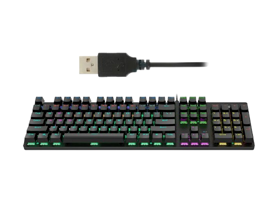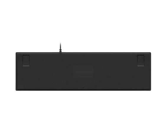 Ngoại hình đen mạnh mẽ, hoàn thiện chắc chắn, kích thước tiêu chuẩn 104 phím — bao gồm cụm phím số đầy đủ.