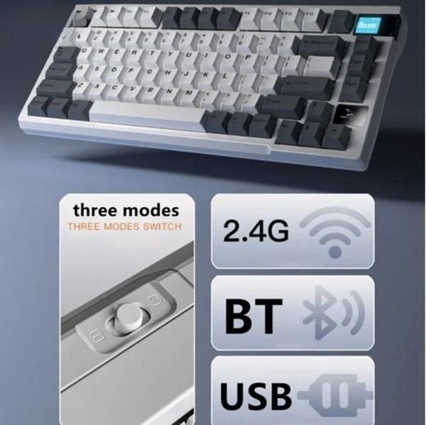 | Đặc điểm nổi bật | • Kết nối 3 chế độ linh hoạt, dễ dàng chuyển đổi giữa laptop, PC, tablet. • Switch Gateron EverFree (hoặc Gateron tùy phiên bản) cho cảm giác gõ mượt và phản hồi tốt. • Khung gasket‑mount cùng lớp mút đa lớp giúp trải nghiệm gõ êm ái và giảm tiếng ồn. • Hot‑swappable toàn bộ switch, thuận tiện cá nhân hóa theo sở thích. • Phím keycap PBT dye‑sublimation, độ bền cao, chống bay chữ, tích hợp màn hình LCD nhỏ • Pin dung lượng lớn (~4 000 mAh) cho thời gian sử dụng lâu dài ở chế độ không dây. • Layout 81 phím gọn gàng (~75%) giúp tiết kiệm diện tích bàn nhưng vẫn đủ phím chức năng. |