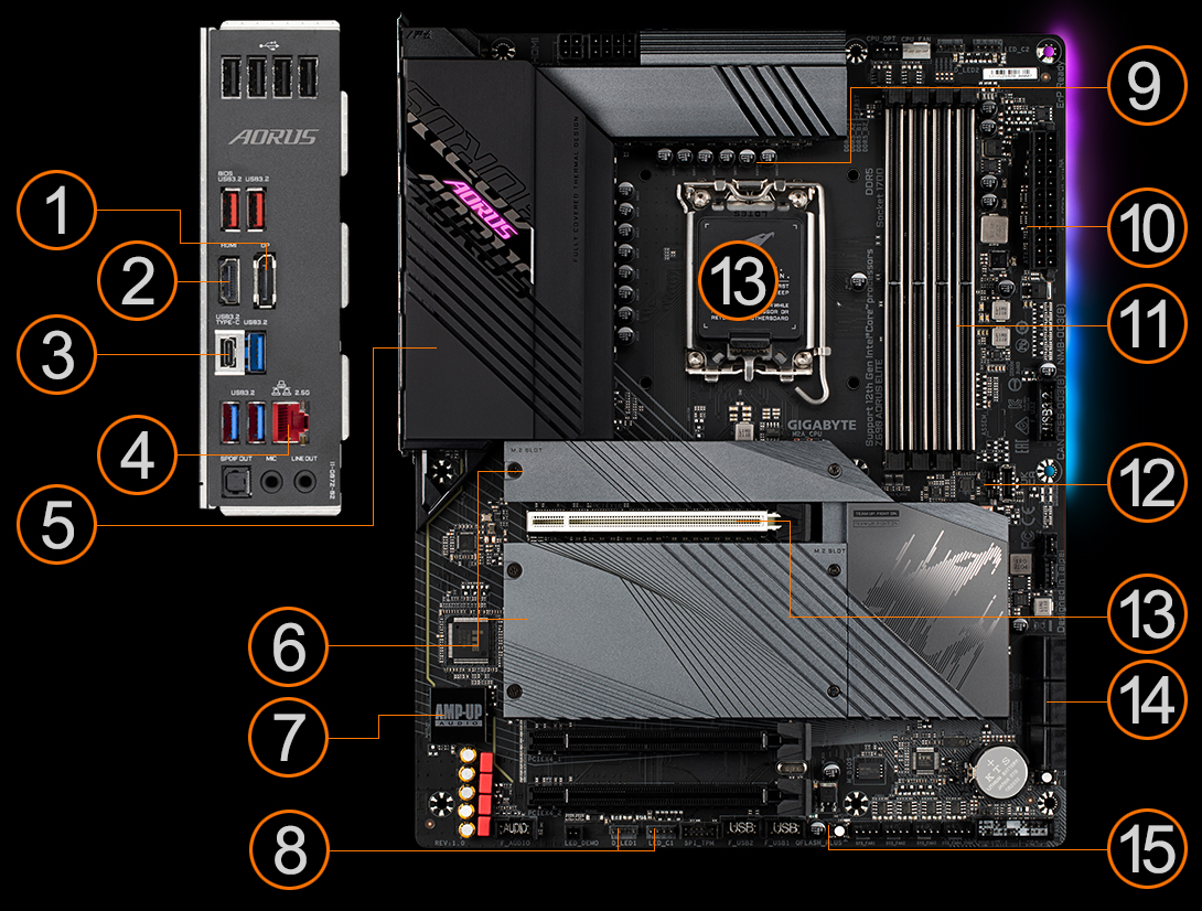 - Gigabyte Z690 AORUS ELITE sở hữu hệ thống chân cắm ARGB cho phép chủ nhân điều khiển đến từng bóng LED của bất kỳ thiết bị kết nối nào có hỗ trợ qua phần mềm RGB Fusion