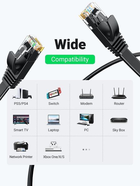 Cáp LAN Ugreen Cat6 30m (mã sản phẩm 50182 / NW102-50182), thiết kế dẹt flat mỏng, sắc đen — lý tưởng cho các đường mạng dài cần đi dây gọn gàng trong nhà hoặc văn phòng. Sản phẩm hỗ trợ truyền dữ liệu tốc độ Gigabit, tương thích tốt với các thiết bị có cổng RJ45.