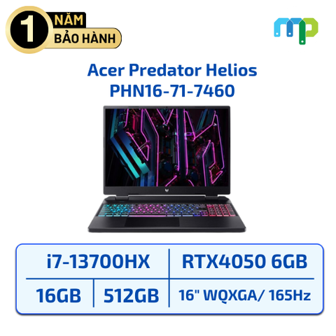 Laptop Acer Predator Helios Neo 16 PHN16-71-7460 là mẫu laptop gaming cao cấp của Acer, hướng đến game thủ và người dùng làm đồ họa chuyên nghiệp. Sở hữu thiết kế đậm chất gaming, cấu hình cực mạnh với Intel Core i7 Gen 13 và card đồ họa RTX 4050, máy đáp ứng hoàn hảo từ chơi game AAA đến render, thiết kế và livestream.