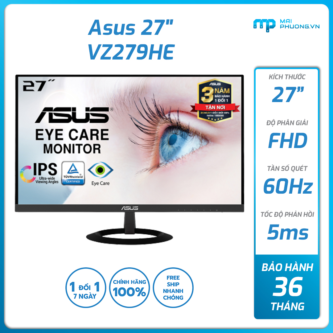 - Màn hình Eye Care ASUS VZ279HE - 27 inch Full HD, IPS, Siêu mỏng, Không viền, Khử nhấp nháy, Bộ lọc Ánh sáng Xanh