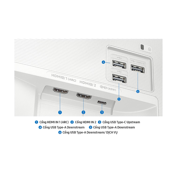 Hỗ trợ nhiều cổng kết nối: HDMI, USB-C Upstream cho phép truyền dữ liệu và sạc, cùng các cổng USB-A để kết nối phụ kiện tiện lợi .