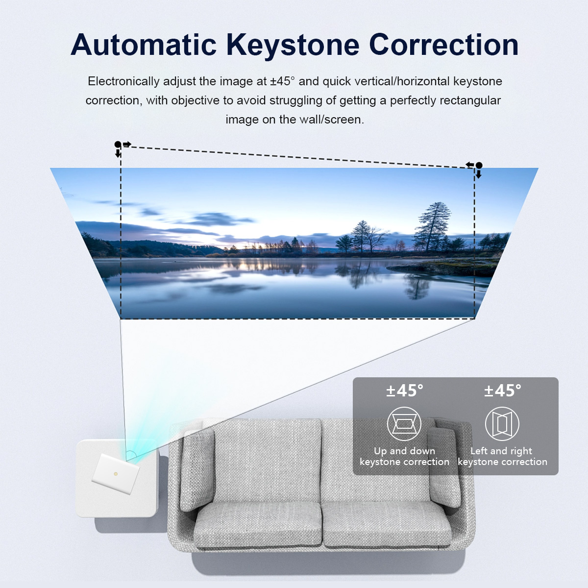 💥 Tính năng keystone correction ±45° cho phép điều chỉnh hình ảnh theo chiều dọc và ngang, dễ dàng đạt được khung chiếu hoàn hảo trên tường hoặc màn chiếu.