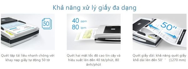 | Đặc điểm nổi bật | - Thiết kế kết hợp Flatbed và ADF, linh hoạt quét tài liệu thường và sách, ảnh, hóa đơn. - Hỗ trợ quét hai mặt tự động, tốc độ cao 40 tờ/phút – 80 ảnh/phút. - Công suất quét lên đến 3.000 tờ/ngày, phù hợp cho doanh nghiệp, ngân hàng, cơ quan hành chính. - Đèn LED tiết kiệm điện, khởi động nhanh, không cần thời gian làm nóng. - Nút điều khiển nhanh (Scan / PDF / Custom) giúp thao tác thuận tiện. - Tích hợp OCR ABBYY FineReader, chuyển đổi tài liệu sang Word, Excel, PDF tìm kiếm. - Tuổi thọ trục cuốn 100.000 lần quét, lẫy tách giấy 25.000 lần – độ bền cao. - Hỗ trợ TWAIN – dễ dàng tích hợp với phần mềm quản lý tài liệu. - Kết nối USB 2.0 ổn định, tương thích đa dạng hệ điều hành Windows và Linux. |