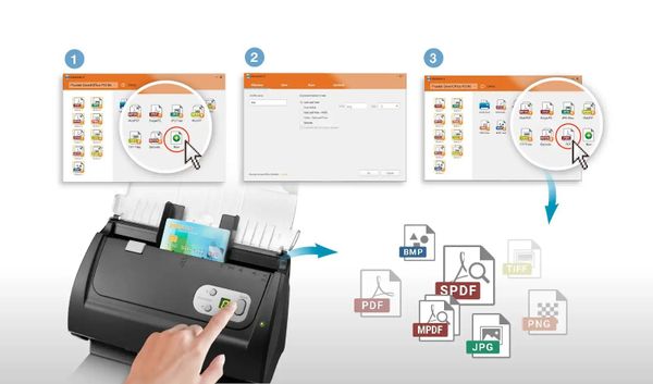 - Máy có khả năng quét giấy từ khổ danh thiếp đến A4/Letter, đồng thời hỗ trợ thẻ nhựa dày tới 1,2 mm như thẻ tín dụng, thẻ ID, bằng lái xe, thẻ y tế hoặc thẻ thành viên.