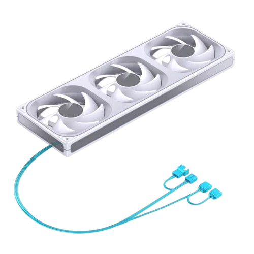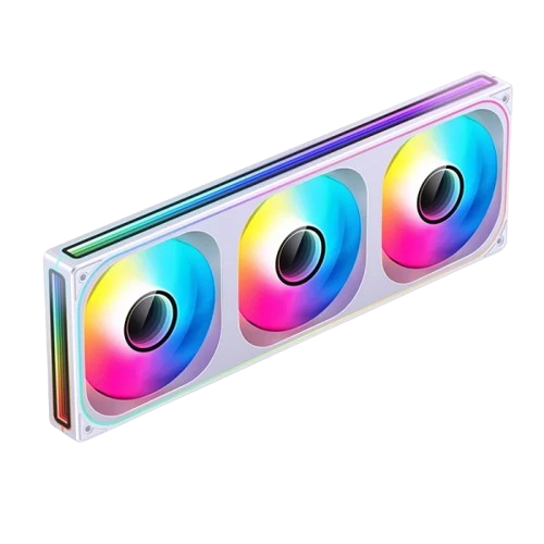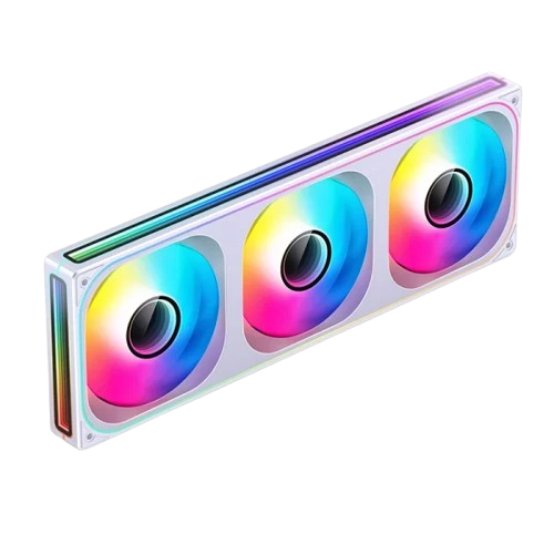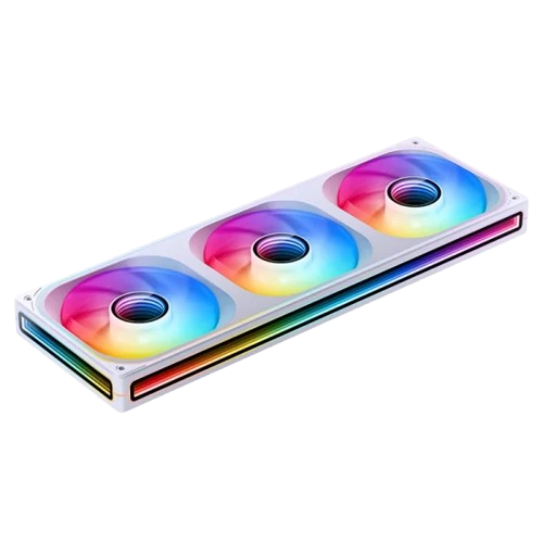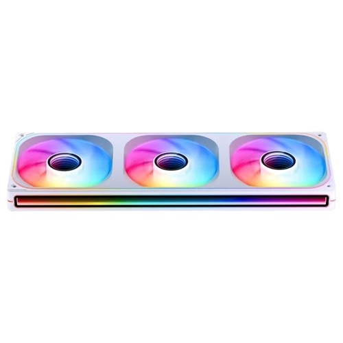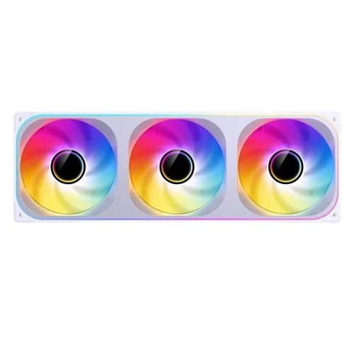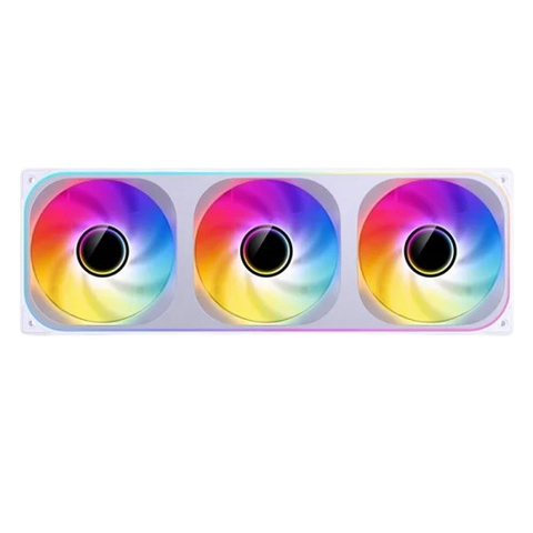 | Đặc điểm nổi bật | - Thiết kế ấn tượng ở cả tâm và viền quạt, tạo chiều sâu ánh sáng độc đáo. - Bộ ba quạt nối liền dạng, dễ dàng lắp đặt cho radiator hoặc vỏ case gaming cao cấp. - Độ ồn thấp, vận hành êm ái, thích hợp cho các hệ thống cần làm mát mạnh nhưng vẫn đảm bảo yên tĩnh. - Tông màu trắng hiện đại, dễ phối hợp với các linh kiện ARGB hoặc build case tone sáng. |