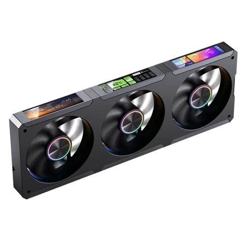 - Ba quạt ARGB 3.38 inch mỗi quạt đều được tích hợp màn hình nhỏ (640 × 180 DPI) hiển thị trạng thái GPU, tốc độ và nhiệt độ, mang lại trải nghiệm cực kỳ sống động và độc đáo.