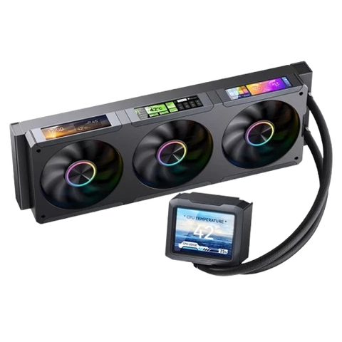 - Màn hình LCD trên bơm có thể hiển thị nhiệt độ CPU (ví dụ 42°C), mức tải và tốc độ quạt, cho phép người dùng theo dõi trực tiếp hiệu suất làm mát ngay trên thân tản nhiệt.