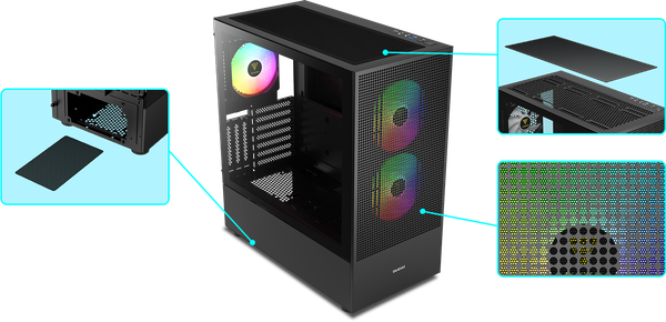 Mặt trước dạng lưới Mesh với lỗ thoáng 5.0mm, tối ưu lưu lượng gió và giảm nhiệt độ hệ thống.